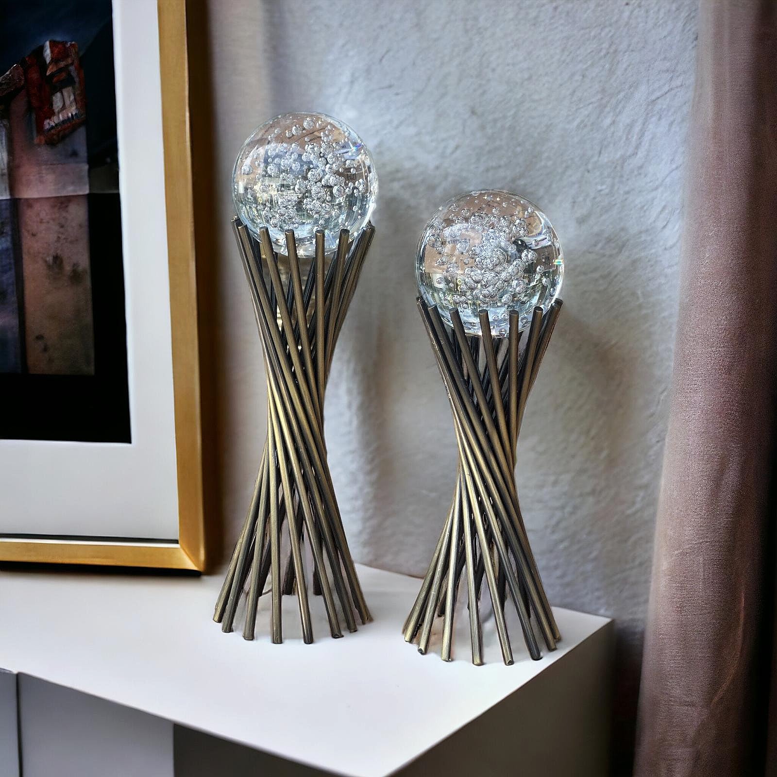 Her bir şeffaf cam küre, içindeki büyüleyici hava kabarcıkları sayesinde dinamik ve ışıltılı bir görünüm sunar. Bronz tonlarındaki burgulu ayaklar ise modern bir yükseliş sağlarken, ortama sıcak ve lüks bir dokunuş katar. Farklı boyutlardaki bu iki küre, birlikte sergilendiğinde uyumlu bir bütünlük oluşturur ve dikkat çekici bir odak noktası yaratır.