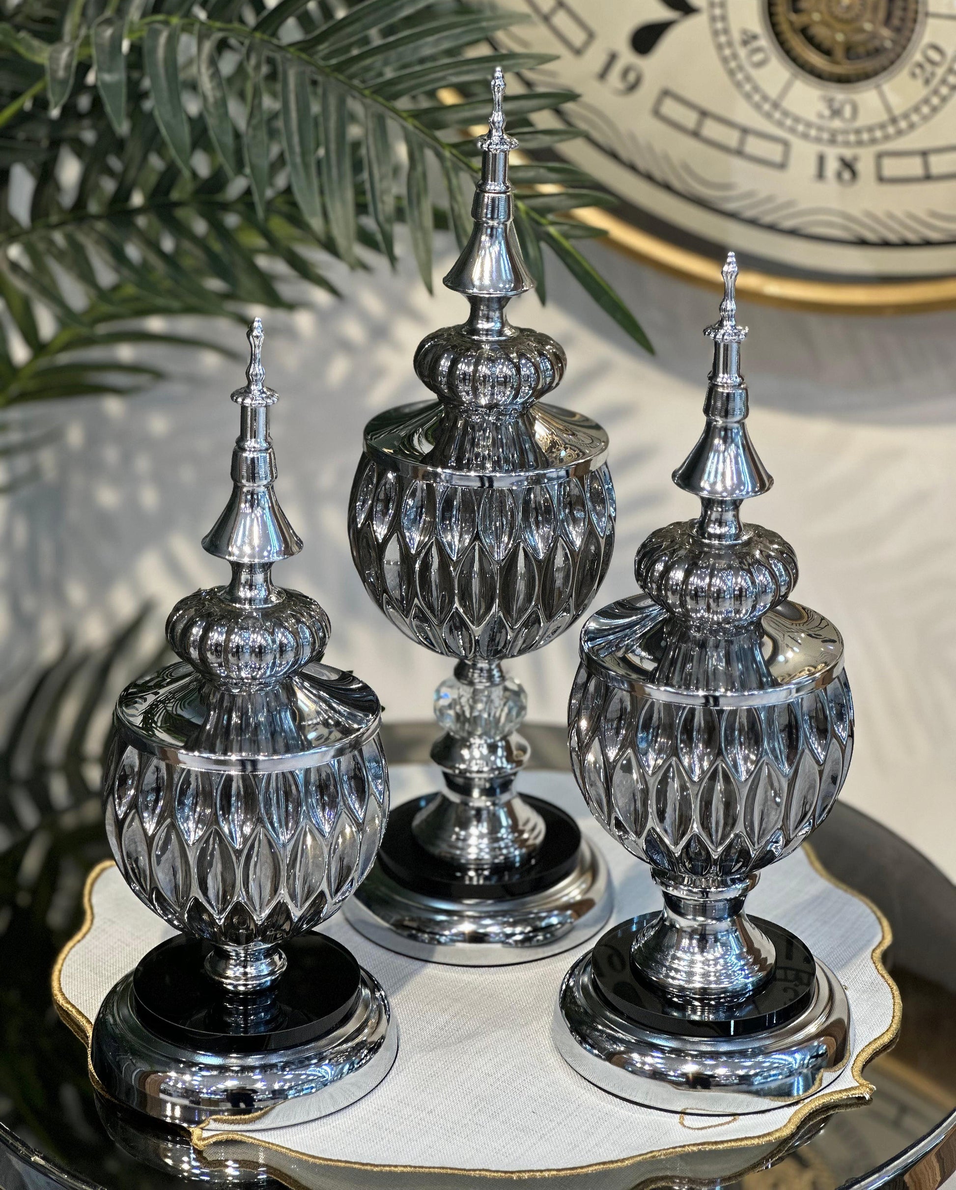 Kubbe Kapaklı Lüx Cam Şamdan Seti 3'lü Gümüş