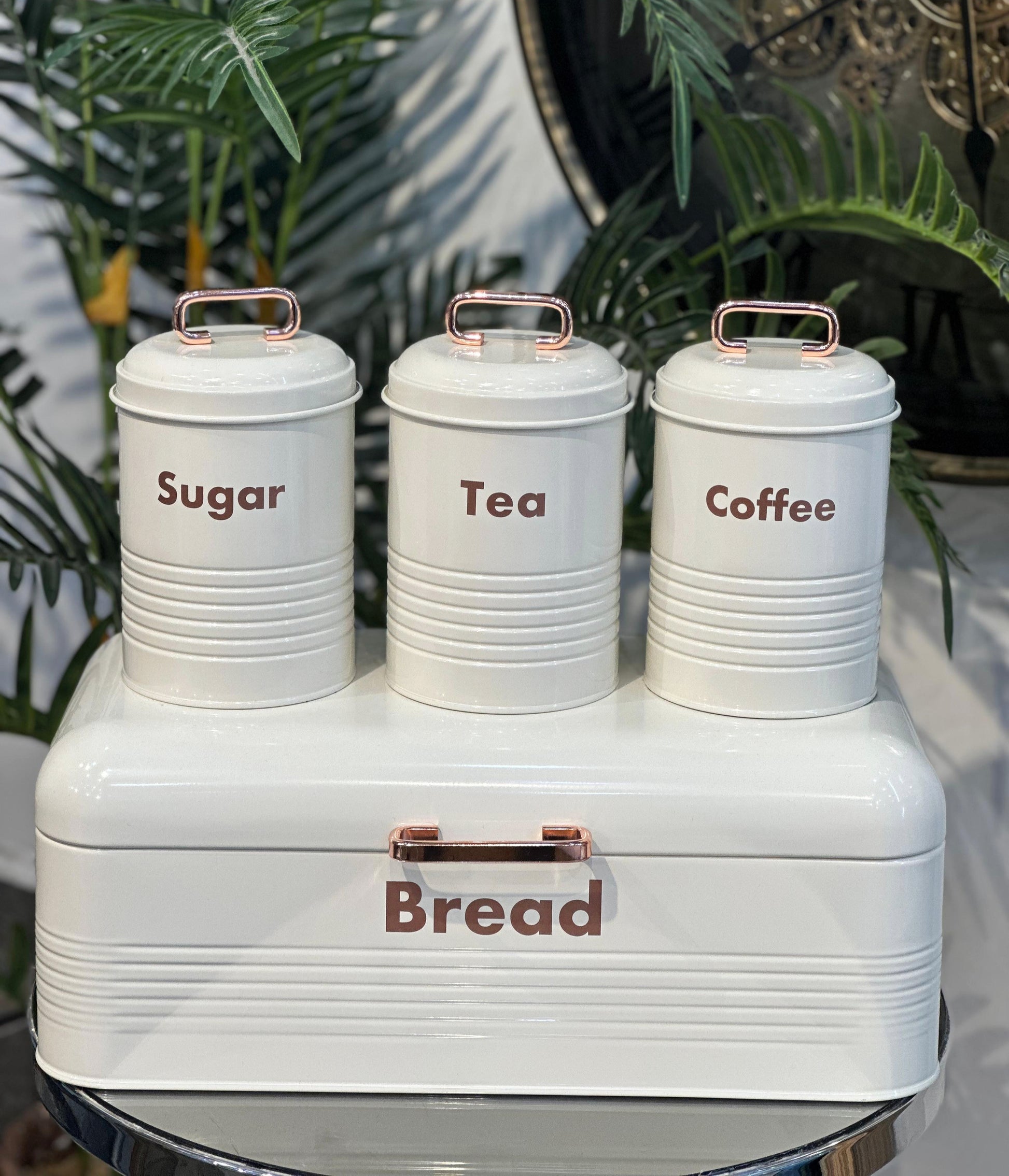 Bu beyaz metal ekmeklik ve 3'lü saklama kabı seti ile mutfaklarınıza hem şıklık hem de işlevsellik katın!