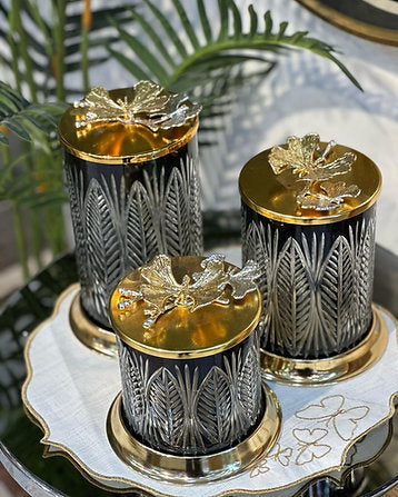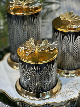 Lüks Yaprak Motifli Siyah Cam Kavanoz Seti 3'lü