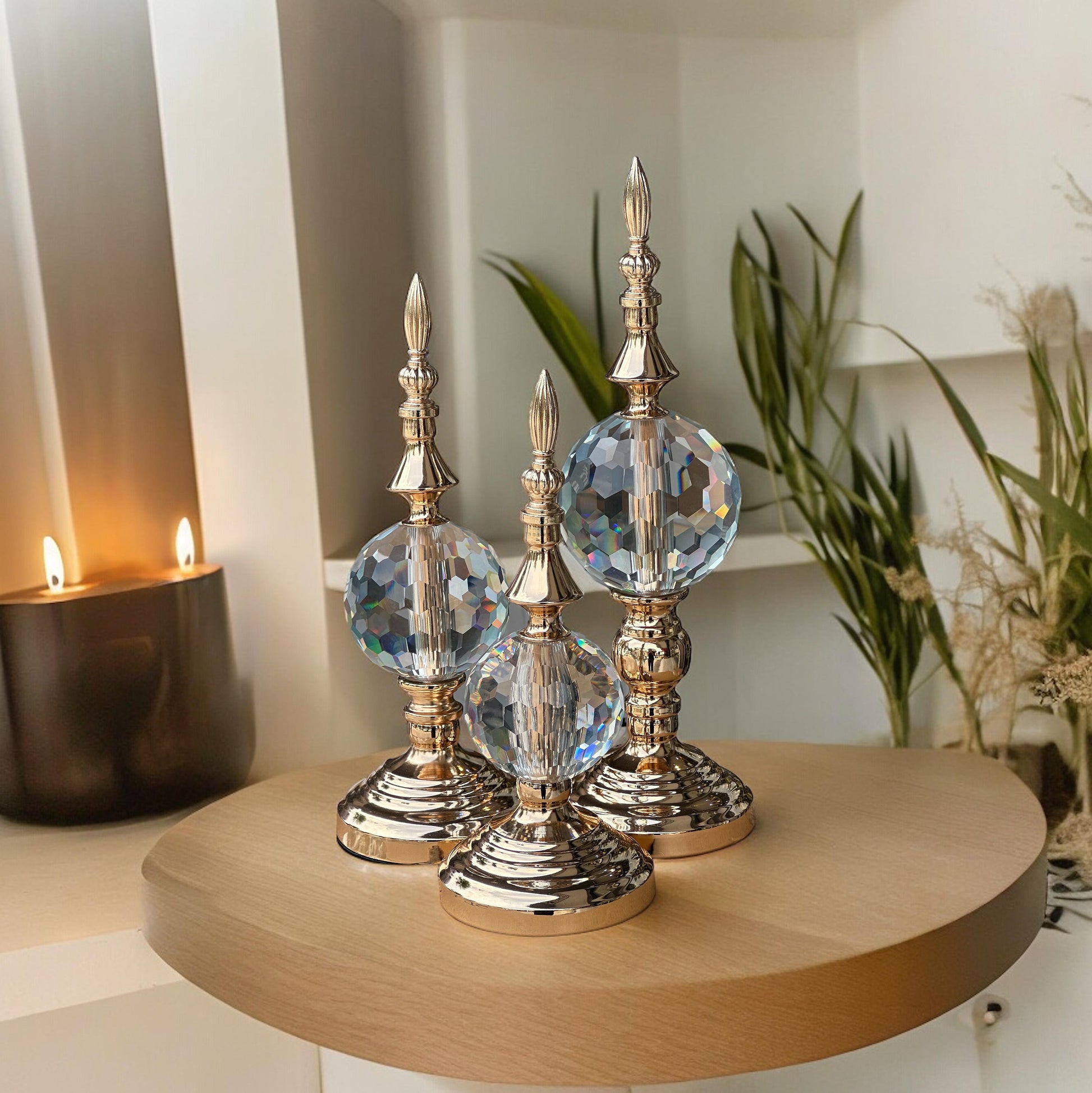 Evinize veya ofisinize sofistike ve modern bir dokunuş katacak bu göz alıcı dekoratif obje seti, petek desenli kristal camın ışıltısı ile alem formunun zamansız zarafetini bir araya getiriyor. Farklı boyutlardaki üç alemden oluşan bu set, mekanınıza derinlik ve estetik bir hava katacak.