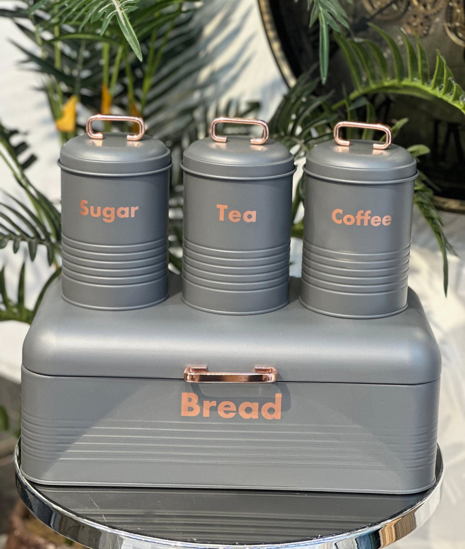 Bu mat gri metal ekmeklik ve 3'lü saklama kabı seti ile mutfaklarınıza hem şıklık hem de işlevsellik katın!