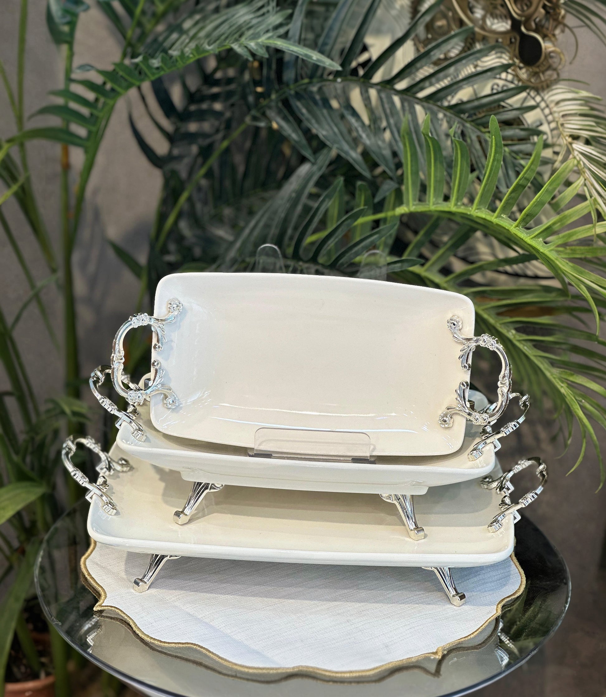 Set, farklı boyutlardaki üç dikdörtgen porselen tepsiden oluşur. Her bir tepsi, yanlarında bulunan oymalı ve parlak gümüş renkli, ergonomik kulplarla sadece taşıma kolaylığı sağlamakla kalmaz, aynı zamanda setin genel estetiğini de yükseltir. Alt kısımlarındaki zarif gümüş renkli ayaklar ise hem stabil bir duruş sunar hem de sunumlarınıza havalı bir yükseklik katar.