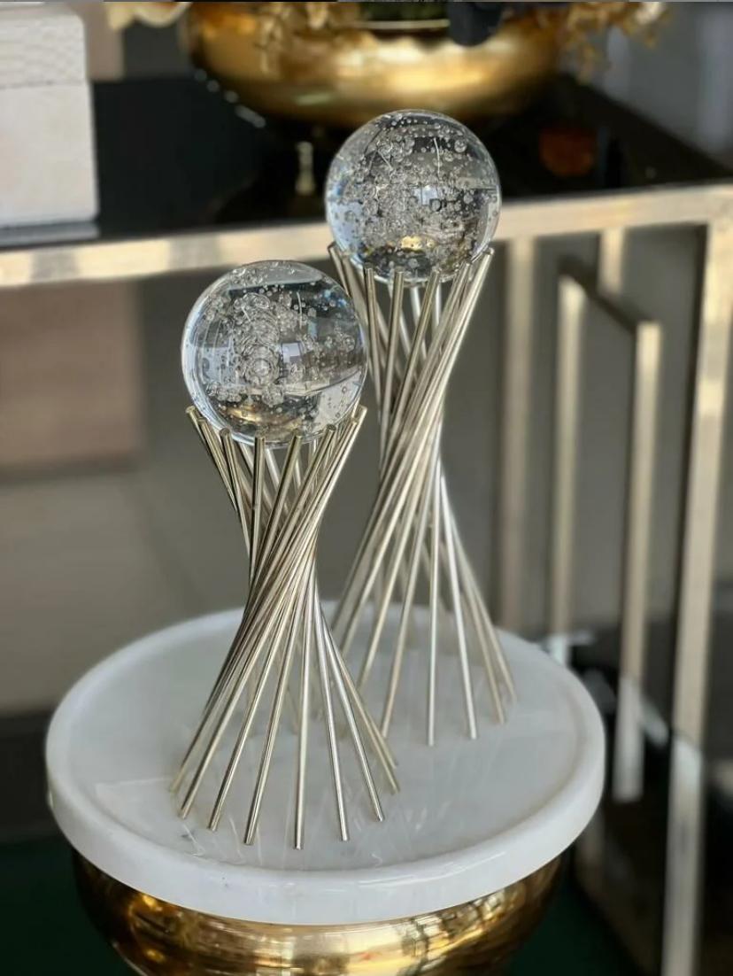 Her bir küre, içindeki hava kabarcıkları sayesinde büyüleyici bir derinlik ve hareketlilik sunarken, gümüş rengi burgulu ayaklar ise sofistike bir yükseliş ve görsel bir akış sağlıyor. Bu iki farklı boyuttaki küre, birlikte sergilendiğinde mekanınıza modern bir sanat eseri etkisi katarken, ayrı ayrı kullanıldığında da her köşeye özgün bir şıklık taşıyor.