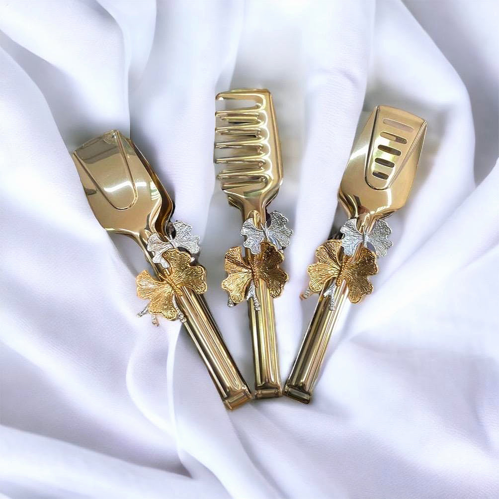 Yemeklerinizi servis ederken hem şıklığı hem de zarafeti bir arada sunmak isteyenler için özel olarak tasarlanan bu kelebek detaylı 3'lü maşa seti, sofralarınıza göz kamaştırıcı bir dokunuş katıyor. Asil parlaklığı ve zarif kelebek detayları ile bu set, özel davetlerinizden günlük yemeklerinize kadar her anınıza değer katacak.
