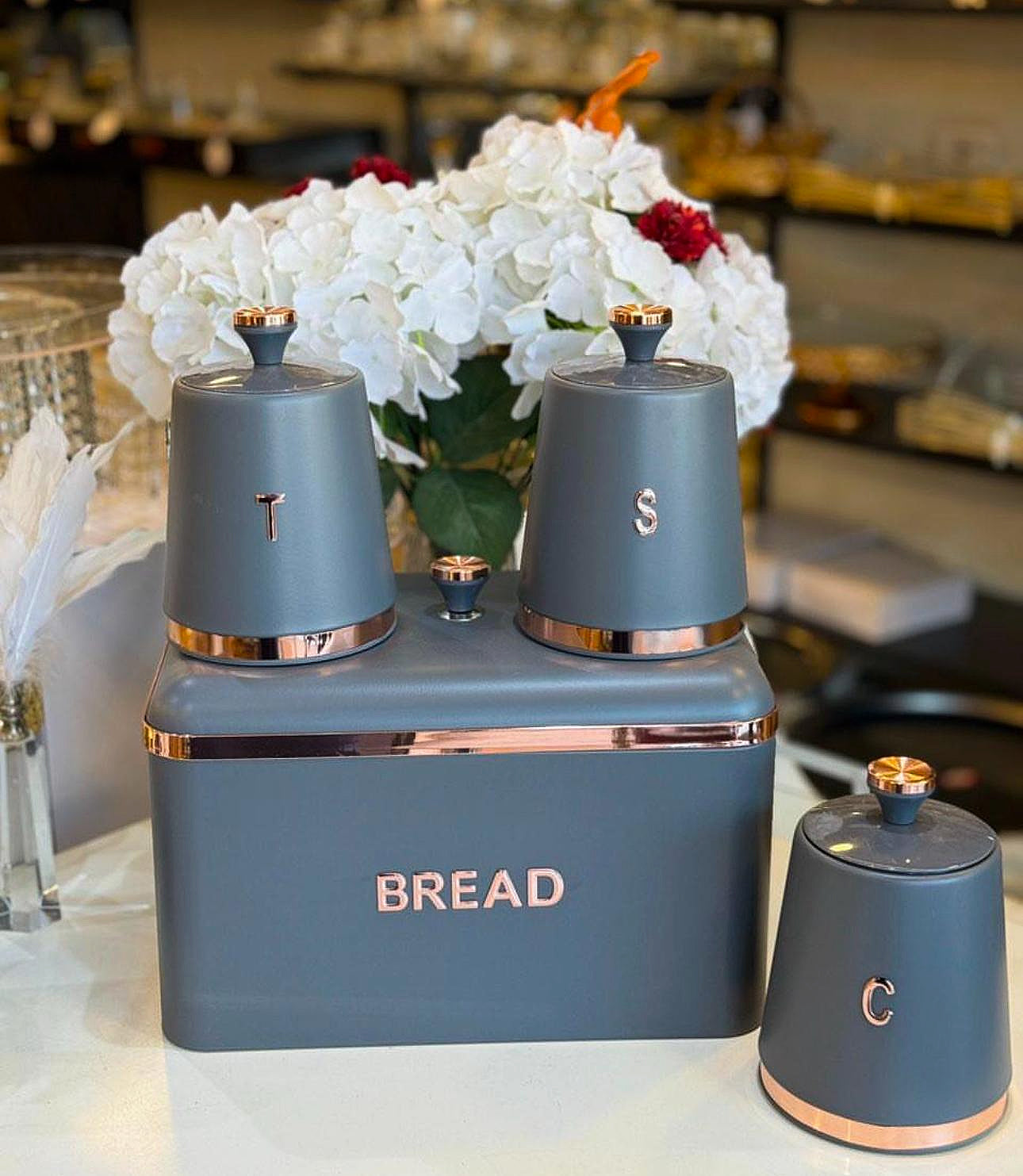 Mutfaklarınıza Modern Şıklık ve Düzen Katın: Gri-Rose Gold Metal Ekmeklik ve 3'lü Saklama Kabı Seti