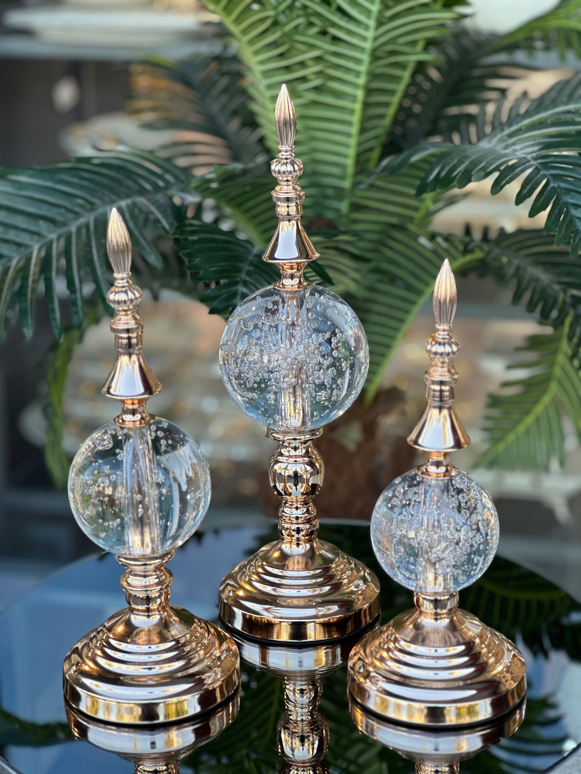 Evinize veya ofisinize romantik ve sofistike bir dokunuş katacak bu göz alıcı dekoratif obje seti, kabarcıklı kristal camın ışıltısı ile alem formunun zamansız zarafetini pembe altın (rose gold) detaylarıyla bir araya getiriyor. Farklı boyutlardaki üç alemden oluşan bu set, mekanınıza derinlik ve estetik bir hava katacak.