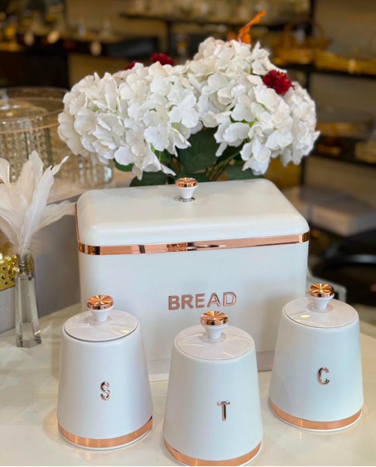 Mutfaklarınıza Modern Şıklık ve Düzen Katın: Beyaz-Rose Gold Metal Ekmeklik ve 3'lü Saklama Kabı Seti