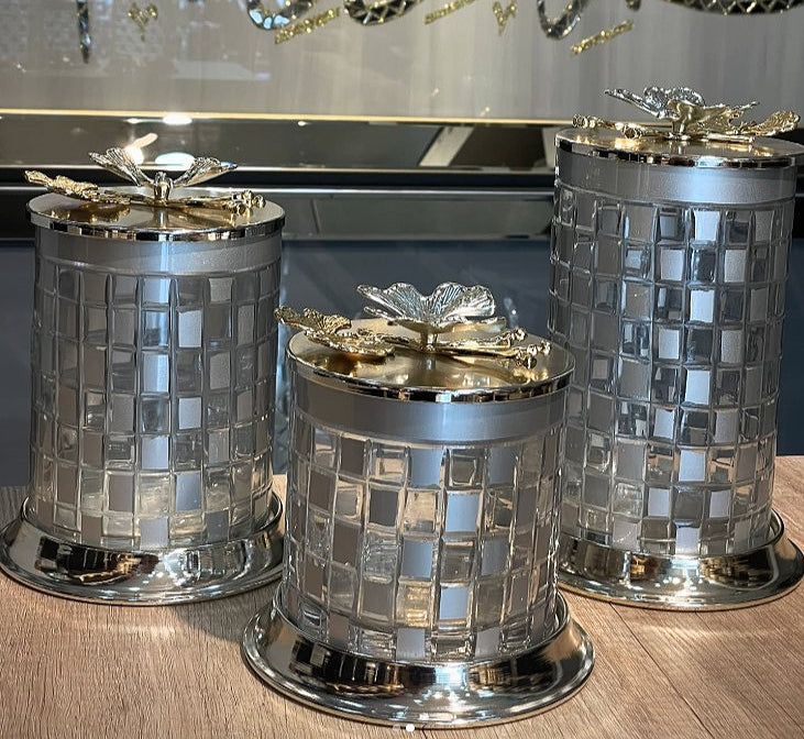 Bu özel kavanoz seti, adını geleneksel dama oyununun zarafetinden ve lüksünden alıyor. Her bir kavanoz, dama deseninin modern bir yorumunu yansıtan gri ve şeffaf karelerle süslenmiş, altın rengi detaylarla zenginleştirilmiştir. Bu benzersiz tasarım, hem dekoratif bir obje olarak hem de işlevsel bir saklama çözümü olarak kullanılmasını sağlar.